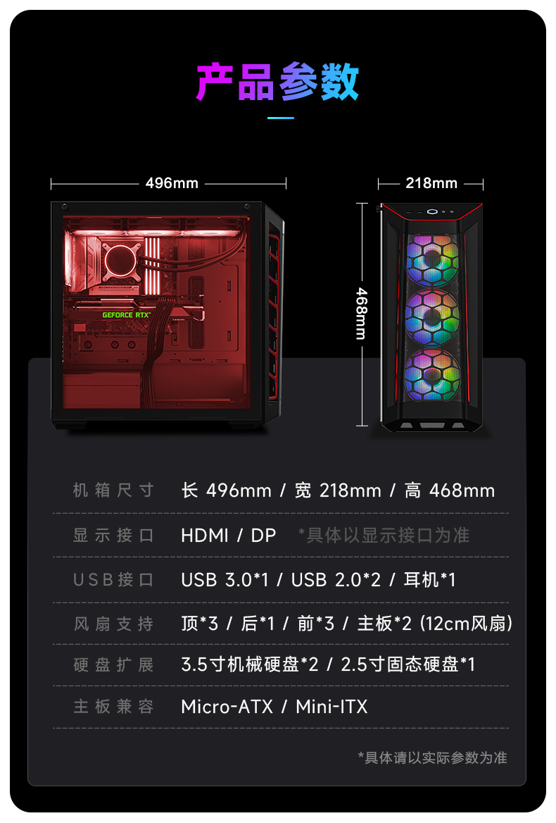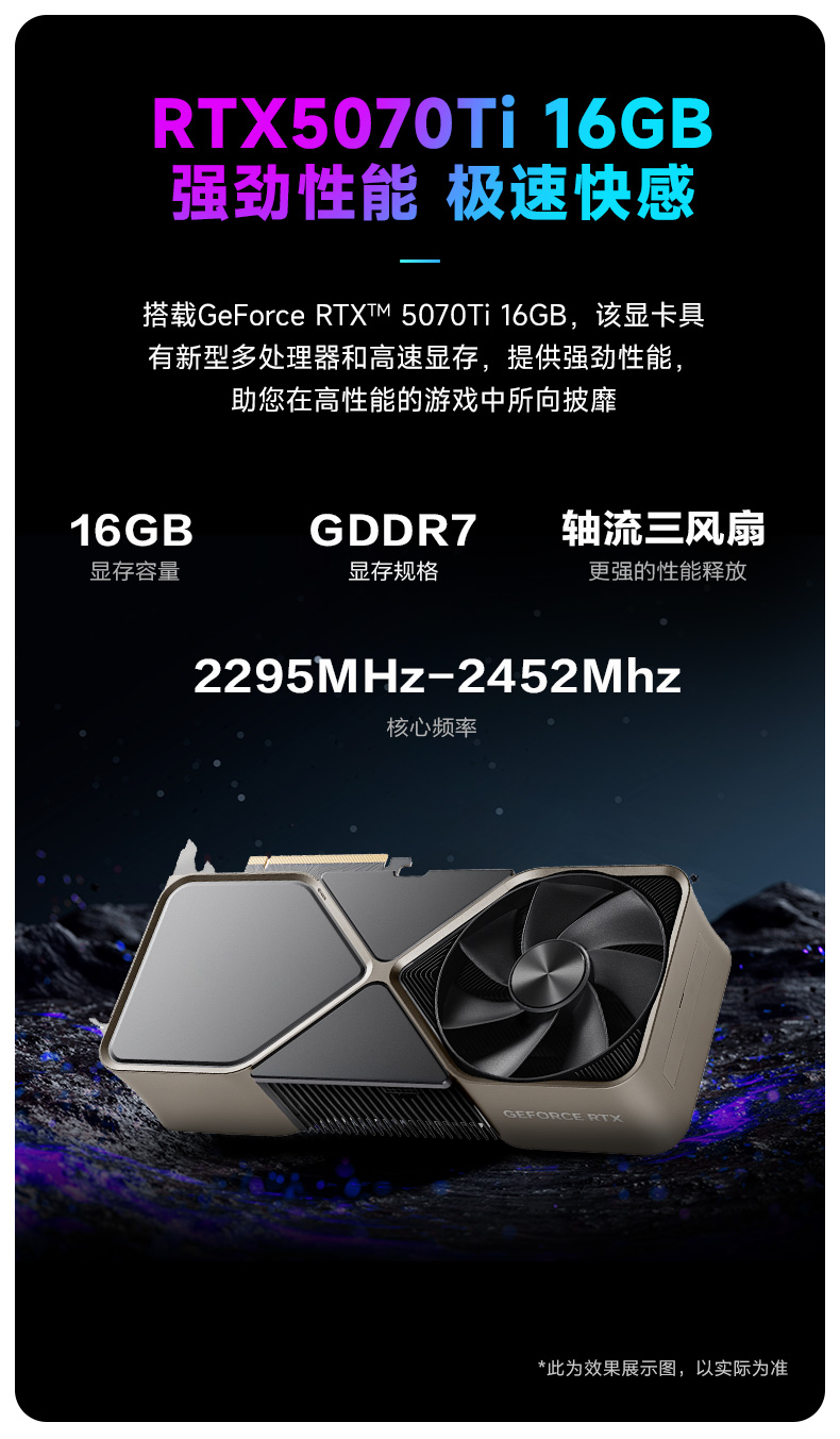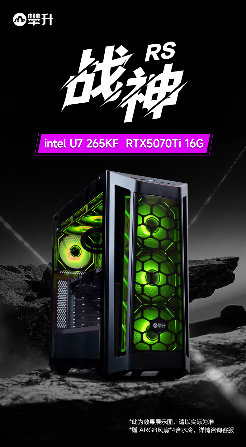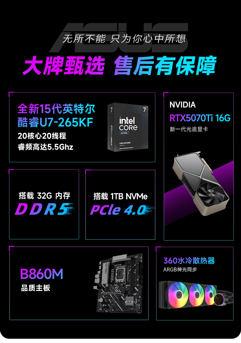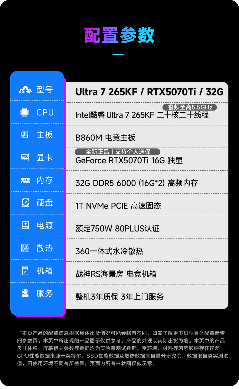 颜色 黑色 处理器 Intel酷睿Ultra7265KF 芯片组 B860M 显卡 GeForce RTX5070Ti 16G 内存 DDR5 32G 硬盘 1TB SSD 电源 750W 外观尺寸 468*218*469(L*W*H) -